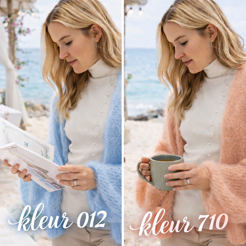 Dit breipakket is voor het echte Bernadette-vest, en dat betekent: breien met 4 dunne draden tegelijk op breinaald 12. Dat is precies wat dit vest zijn kenmerkende, fluffy en luchtige look geeft.