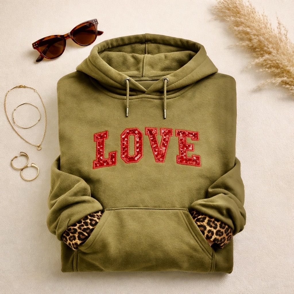 Deze stijlvolle unisex hoodie in een mooie kaki kleur is dé perfecte combinatie van comfortabel en opvallend. De sweater is afgewerkt met het woord LOVE, gemaakt van echte pailletten die zorgen voor een speels en luxe effect.