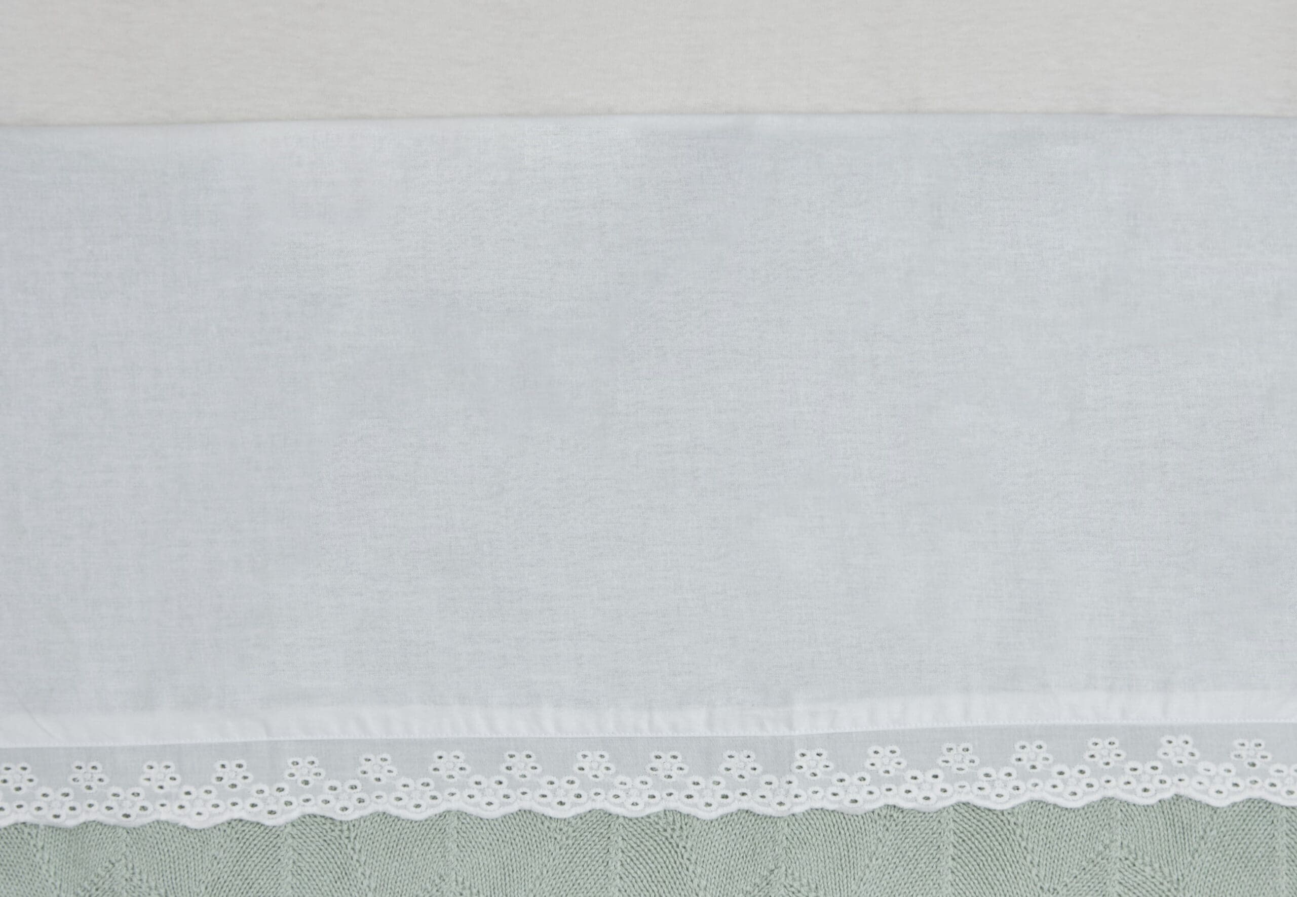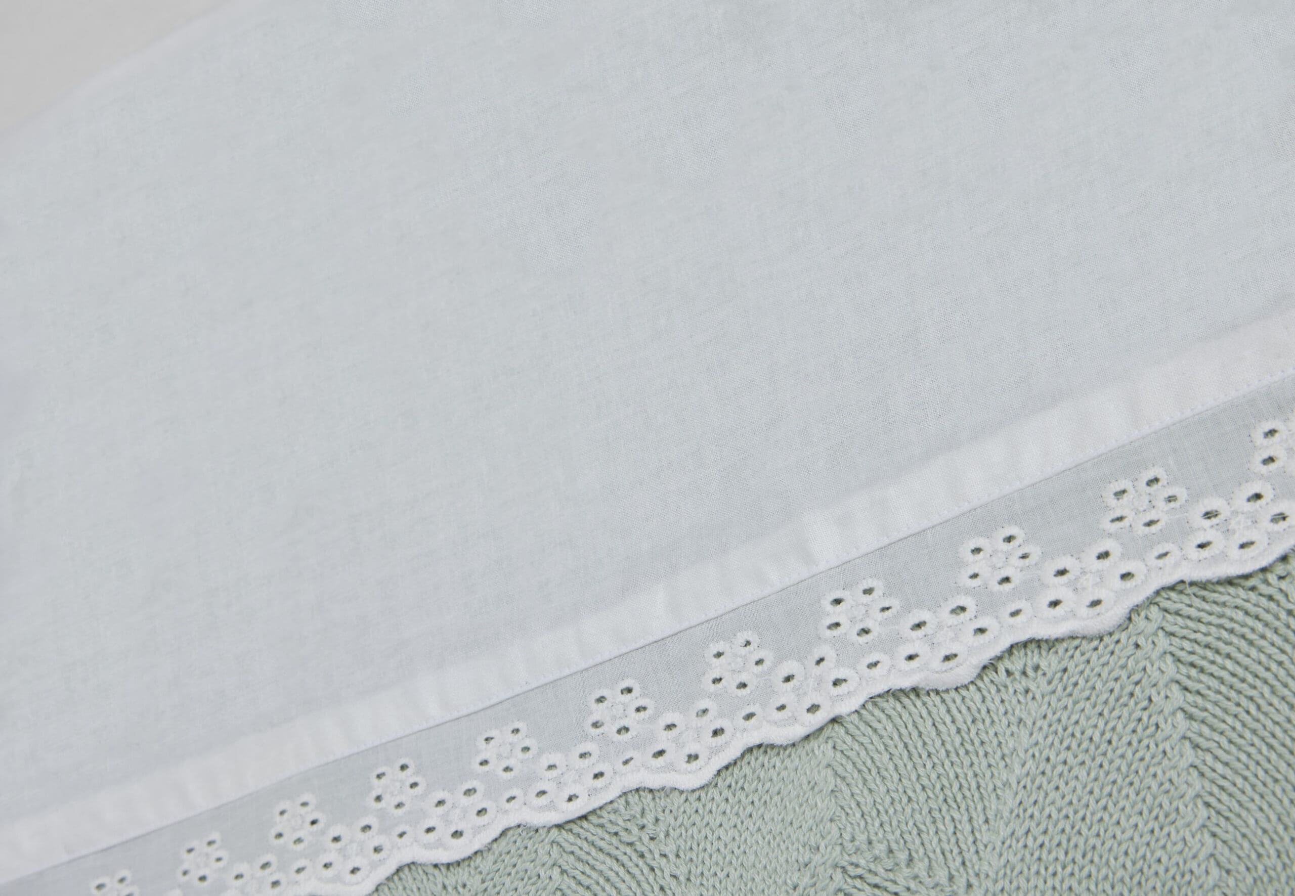 Een zacht ivory lakentje voor de wieg met kanten bies, speciaal gepersonaliseerd met de naam van het kindje.