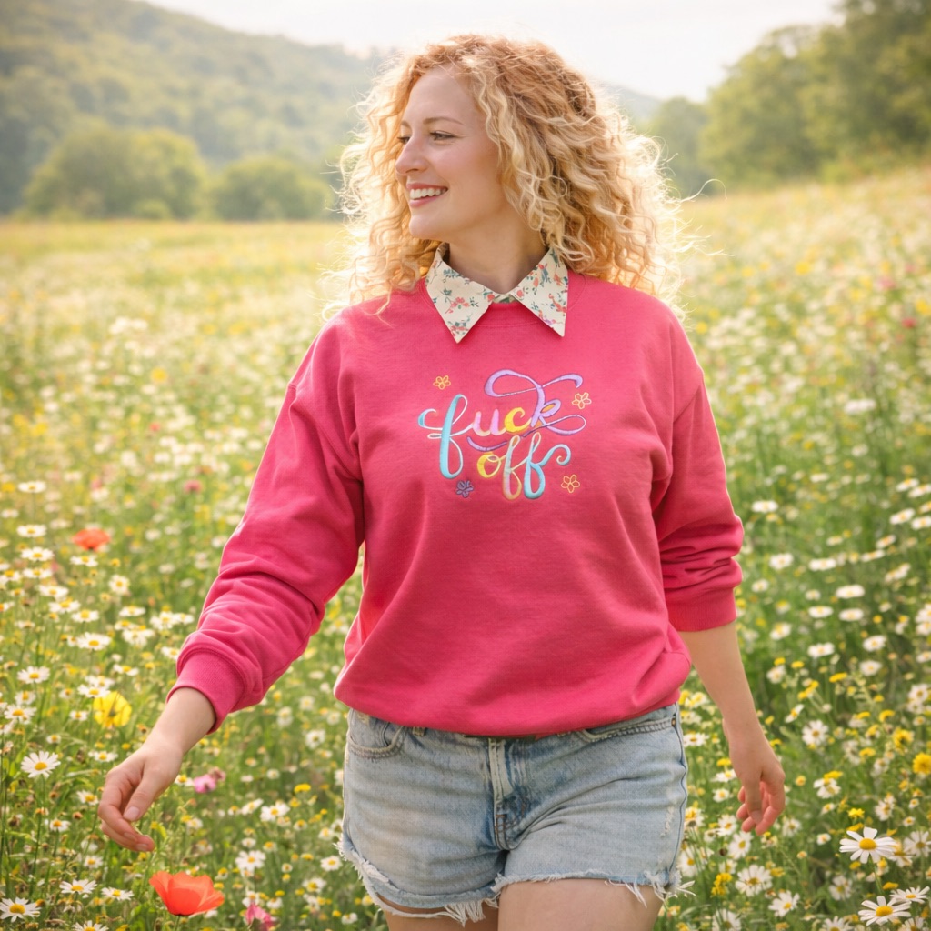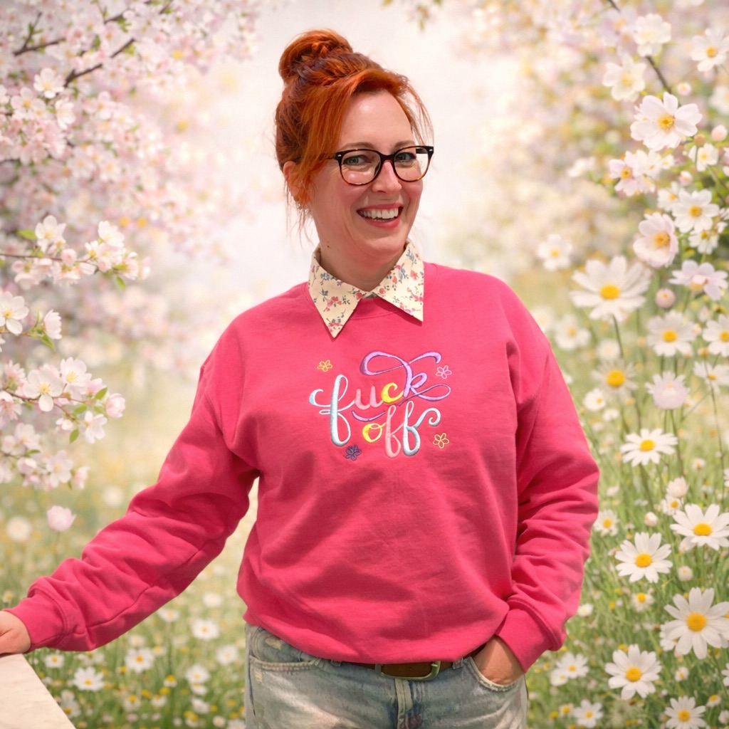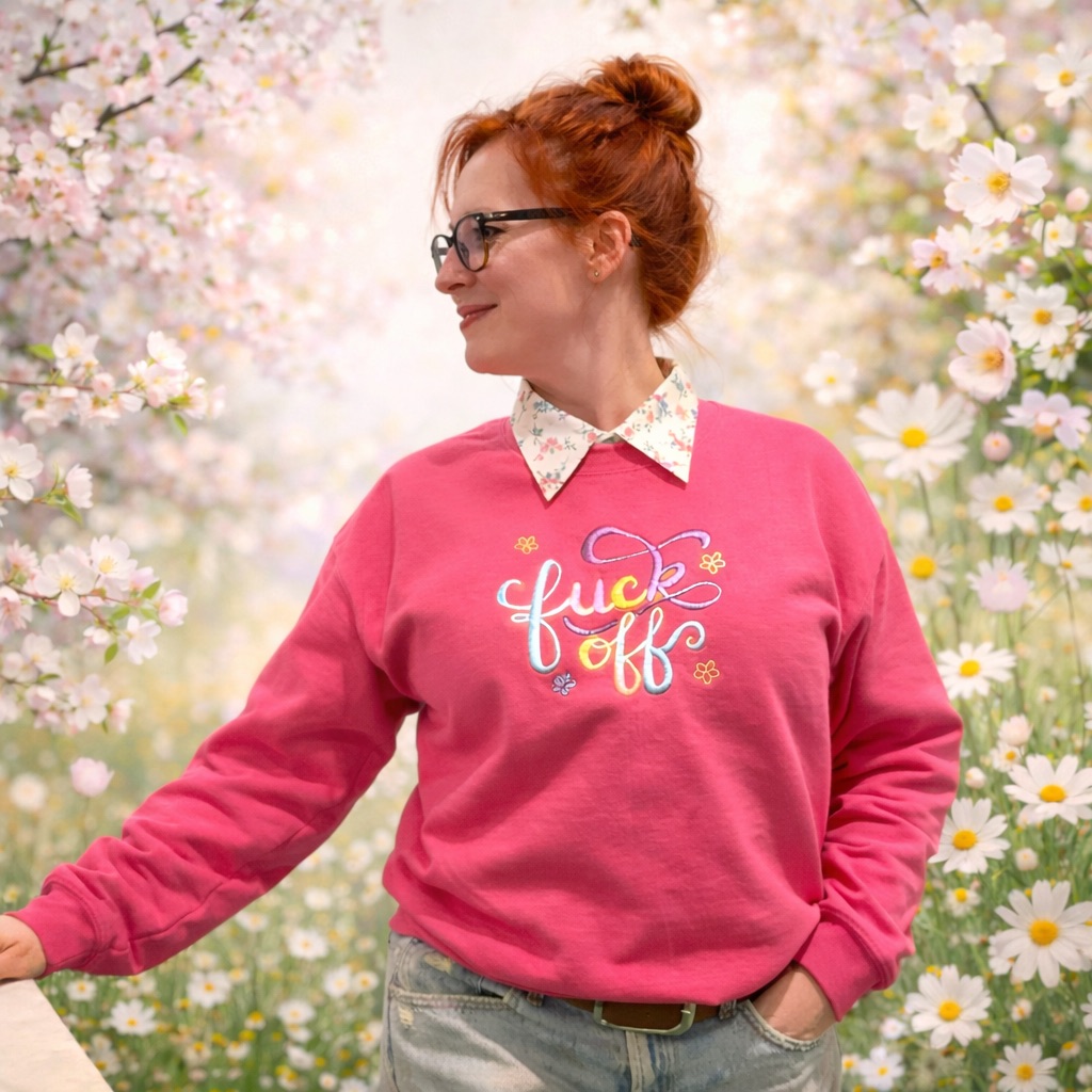 Deze uniseks sweater met fuck off geborduurd in pasteltinten is comfortabel, warm en een tikje eigenwijs.