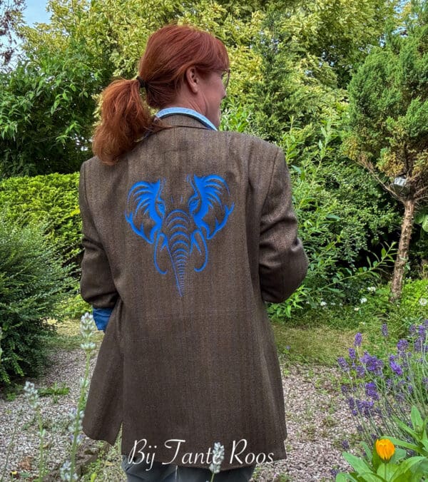 Dit is een mooi heren colbert in maat 54. Achterop zit een print van een olifant gemaakt van Flex. Het jasje is een visgraat bruin met kobaltblauwe accenten en is z.g.a.n. en mooie kwaliteit. Het merk is Carl Gross. Heel leuk om lekker oversized te dragen.